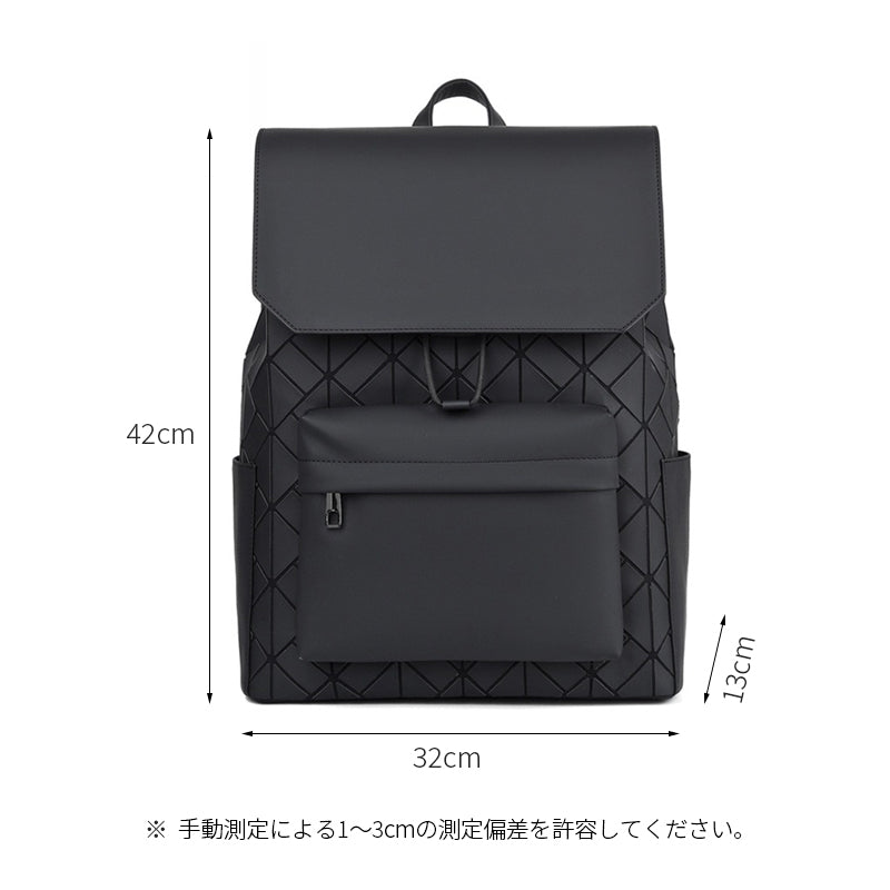 スタイリッシュでモダンなデザインが魅力のバックパックです。シンプルながらも洗練された外観は、どんなシーンにもマッチします。特に、ブラックカラーのボディに、幾何学的なパターンが施されており、視覚的な美しさとともに高級感を演出しています。