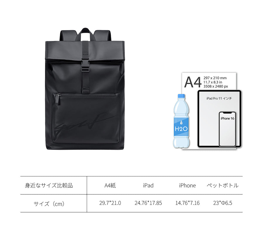 その洗練されたデザインが一目で印象に残るスタイリッシュなバックパックです。ブラックのシンプルかつエレガントなカラーが特徴で、どんなスタイルにもマッチします。