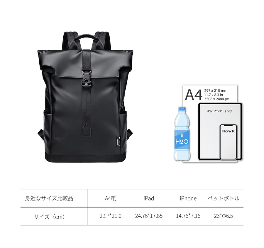 クリーンなラインとシームレスな外観で、都会的な雰囲気を醸し出するバックパックです。ブラックカラーのシックな見た目は、どんなファッションにもマッチしやすく、特にビジネスシーンやカジュアルな日常使いに最適です。