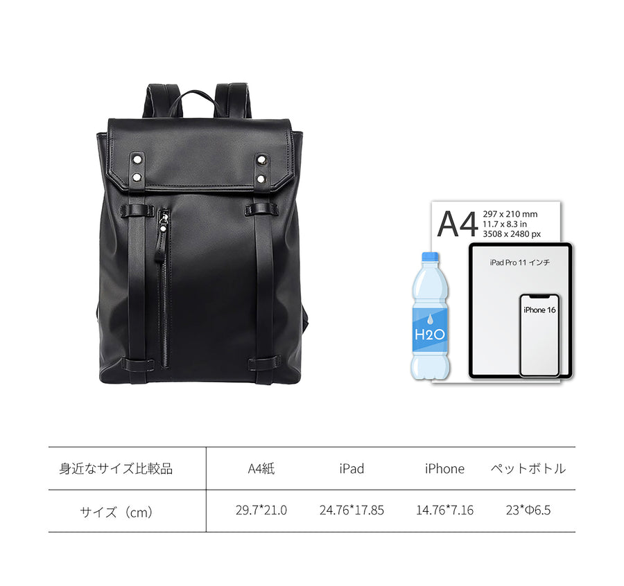 現代のファッションセンスを取り入れた洗練されたデザインが特徴的なバックパックです。シンプルでありながらも、スタイリッシュなフォルムは、どんなシーンにもマッチします。フロントに配置されたジッパーポケットと装飾的なベルトがアクセントとなり、機能性とデザイン性を両立しています。