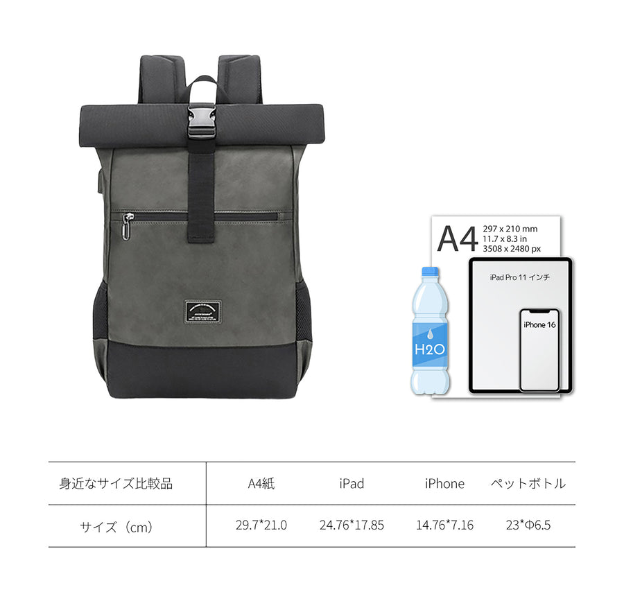メインコンパートメントはロールトップ形式となっており、見た目のすっきりさを保ちながら、収納容量を自在に調節できます。高品質なPUレザーを使用しており、撥水性に優れているため、雨の日でも中身を安心して保護できます。裏地には耐久性のあるポリエステル素材を採用しており、長期間の使用にも耐えうる構造です。