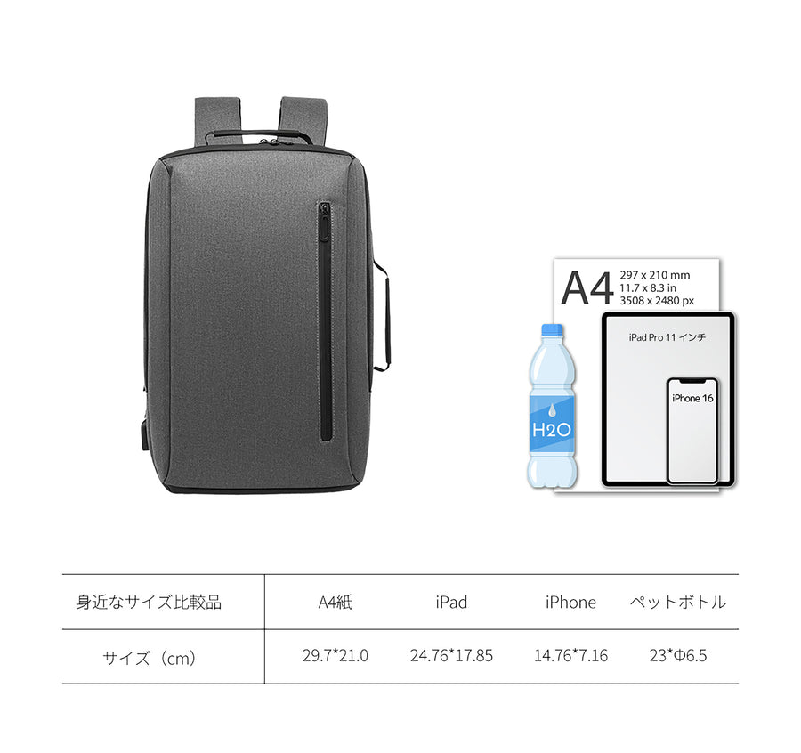 シンプルながらもエレガントな外観は、ビジネスシーンに最適なバックパックです。フロントにはスタイリッシュなファスナー付きポケットが配置され、実用性とデザイン性を兼ね備えています。