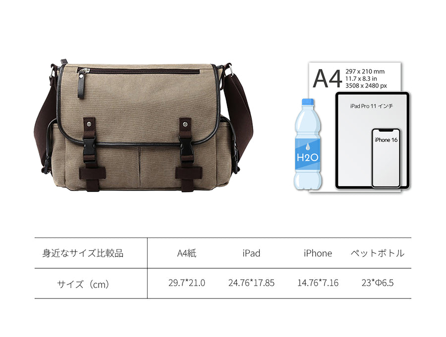 シンプルかつ洗練されたデザインが特徴的なクラシックキャンバスショルダーバッグです。フロントには2つのバックル付きポケットがあり、これによりアクセサリーや小物を素早く取り出すことができます。