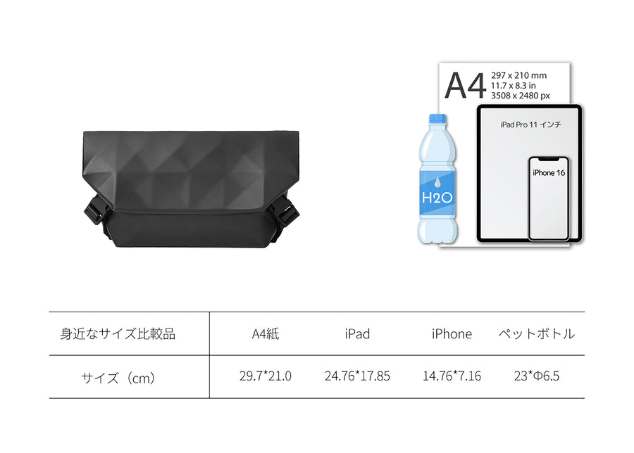 高品質なPUレザーを使用しており、耐久性と撥水性に優れています。表地は滑らかで手触りが良く、日常の使用にも耐える強度があります。裏地にはポリエステル素材を採用しており、内部をしっかりと保護します。ショルダーベルトもPUレザー製で、長さ調整が可能なため、使用者の好みに合わせて最適なフィット感を得ることができます。
