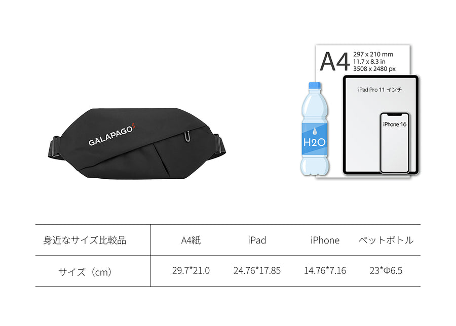 小ぶりで体にフィットする形状が、アクティブなシーンにぴったりです。ジッパー付きのポケットが配置されており、スマートフォンや財布などの小物を簡単に収納できる実用性も備えています。