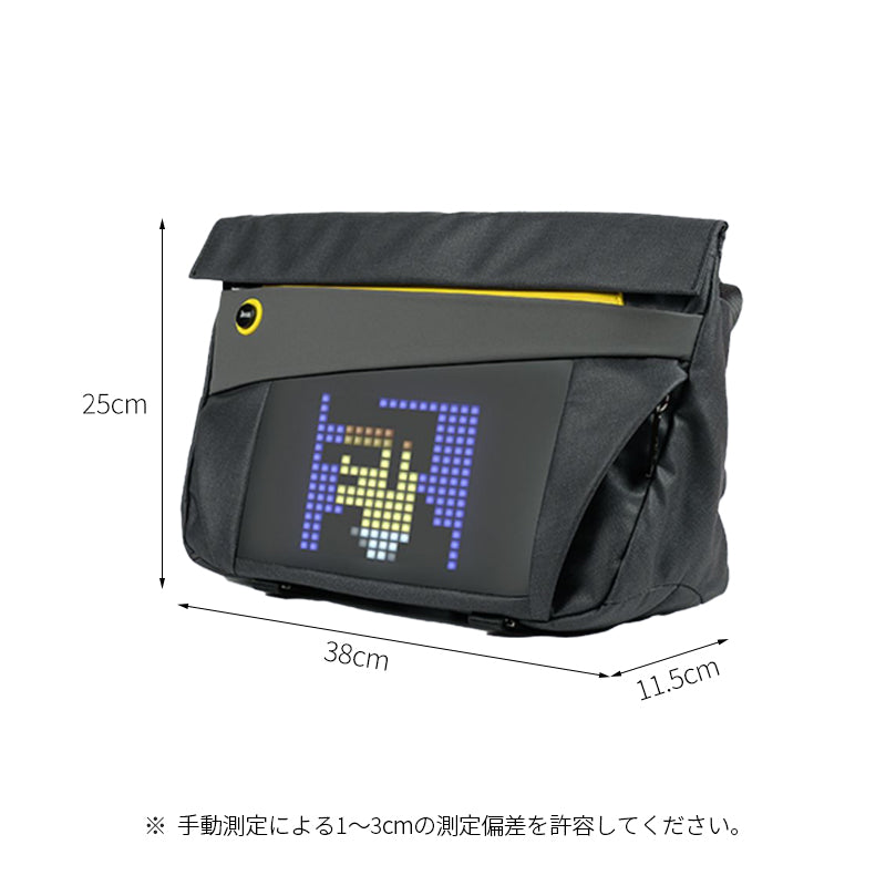 洗練されたデザインと最新テクノロジーを融合させたクロスボディバッグです。16x16cmのピクセルディスプレイがバッグの正面に配置され、専用アプリ「Divoom」を使用して自分だけのアニメーションやメッセージを表示可能。遊び心あふれるデザインで、ファッションのアクセントとしても活躍します。